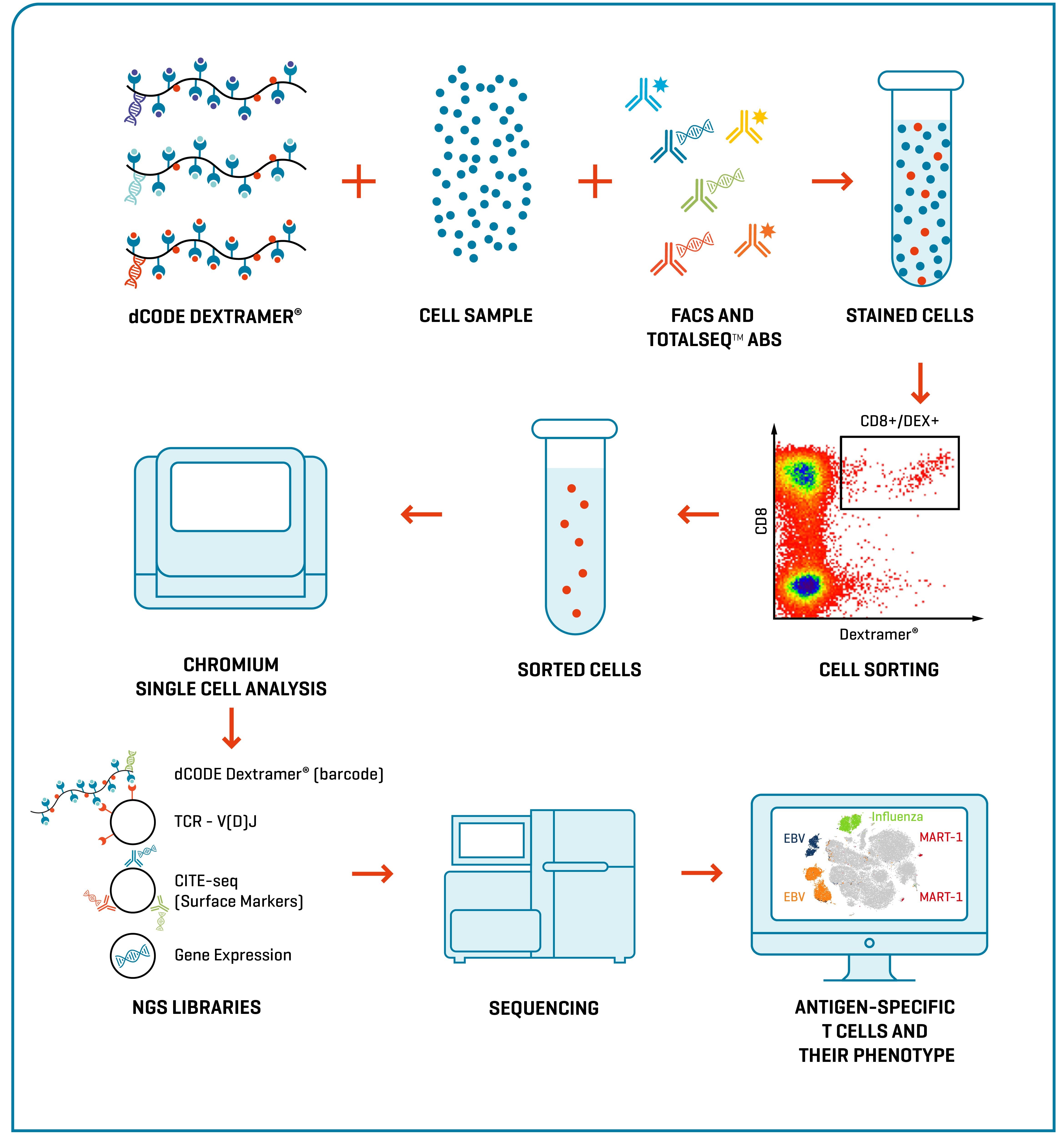 • Link TCR Sequence to Cognate pMHC: dCODE Dextramer® reagents reveal TCR-pMHC interactions.