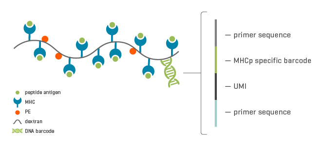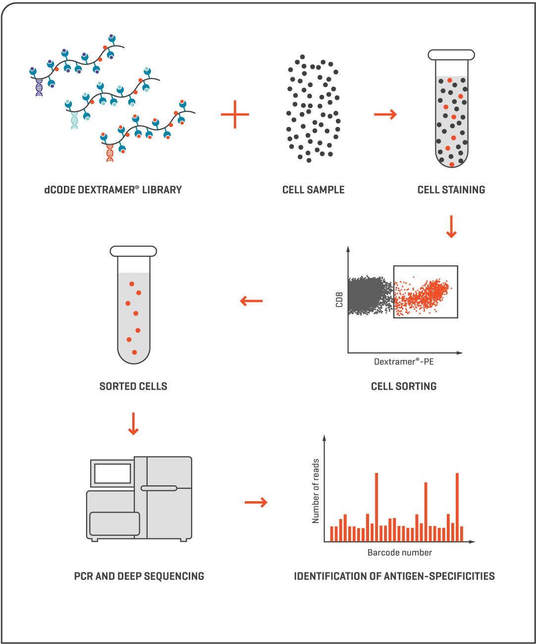 dCODE Dextramer® (HiT) reagents are designed for multiplexing, allowing the identification of many different T-cell specificities in the same sample. Ensure an efficient detection of T-cell populations using next-generation sequencing (NGS)
