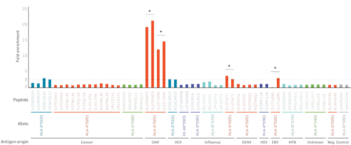 Among 56 different antigen-specificities screened in the PBMC sample, four antigen-specific T-cell responses were identified (shown by asterisks *) and further validated by flow cytometry.