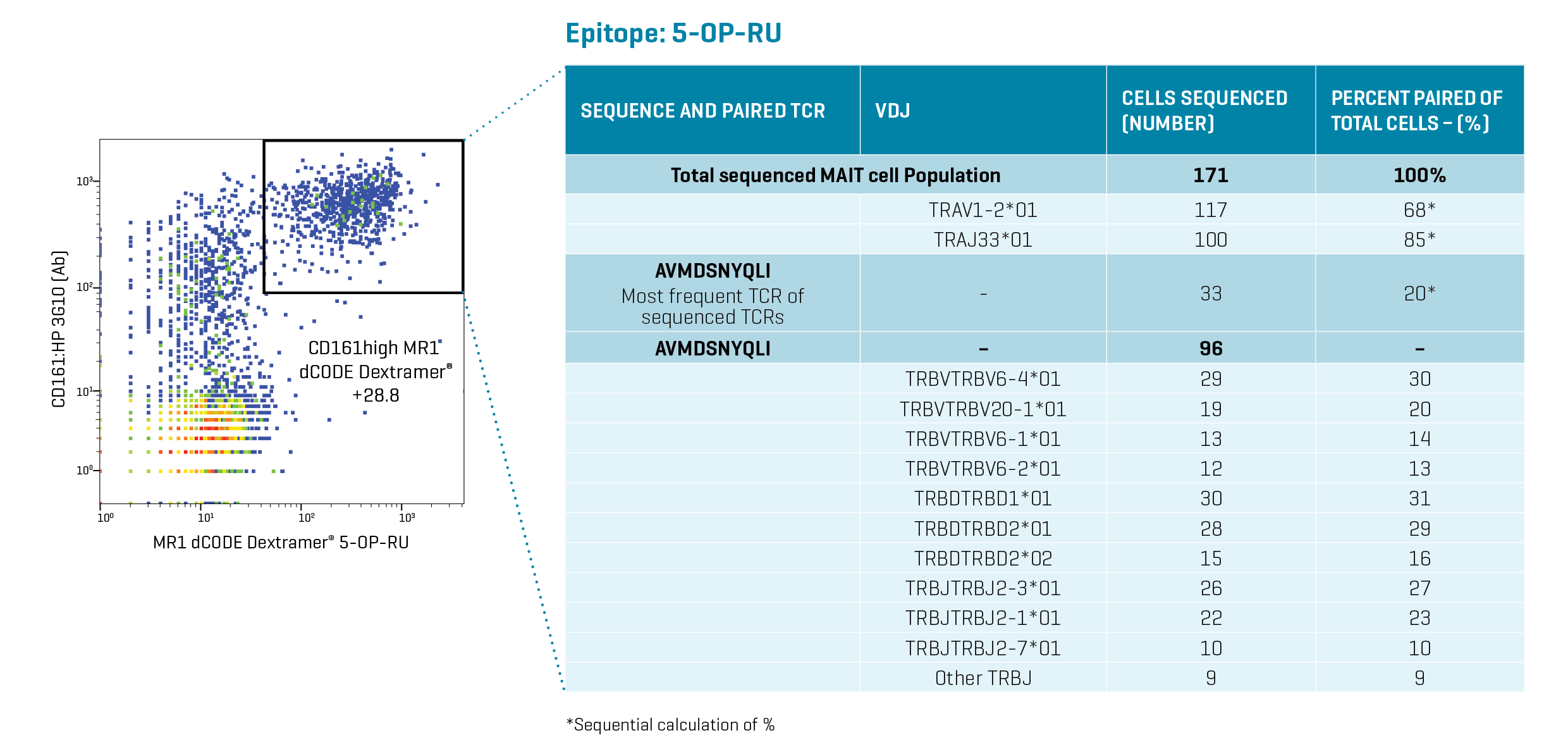 In a proof of concept study, we analyzed the TCRs of 171 CD3+ CD161+ 5-OP-RU-specific MAIT cells using MR1 dCODE Dextramer®. Intriguingly, the majority of the analyzed TCRs belonged to the TRAV V1-2*01 subtype and generally exhibited low variability.