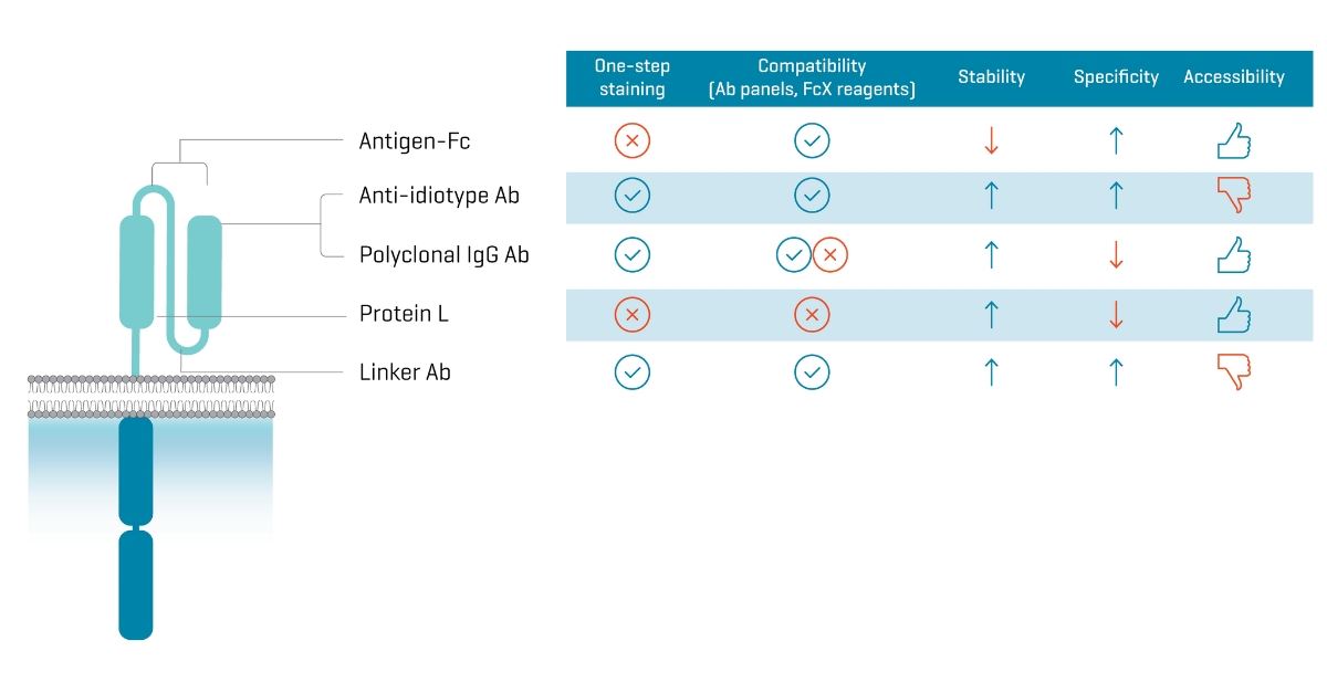 Figure 1. Features of protein staining agents currently used to characterize CAR-T cells. Binding locations on the extracellular domain of a CAR are labeled in the diagram on the left.