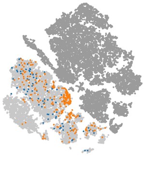 Figure 4. t-SNE plot of all T and B cells captured in the single-cell analysis. B cells captured at the first time point (immediately after recovery) are shown as blue dots and at the second time point (5 weeks post-recovery) as orange dots. Non-B cells are shown as gray dots.