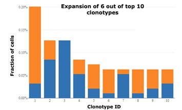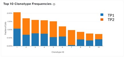 Figure 7. Among the most frequent TCR clonotypes sequenced, two clonotypes (2 and 7) recognized the immunodominant ORF1ab epitope and were expanded at time point 2 (5 weeks post recovery; orange) compared to time point 1 (immediately after recovery; blue).