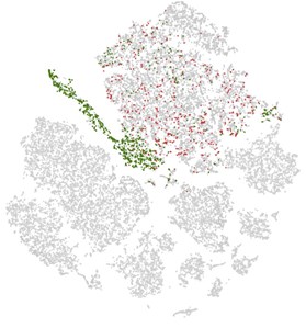 Figure 6. t-SNE plot of all T and B cells captured in the single-cell analysis. T cells captured at the first time point (immediately after recovery) are shown as red dots and at the second time point (5 weeks post-recovery) as green dots.