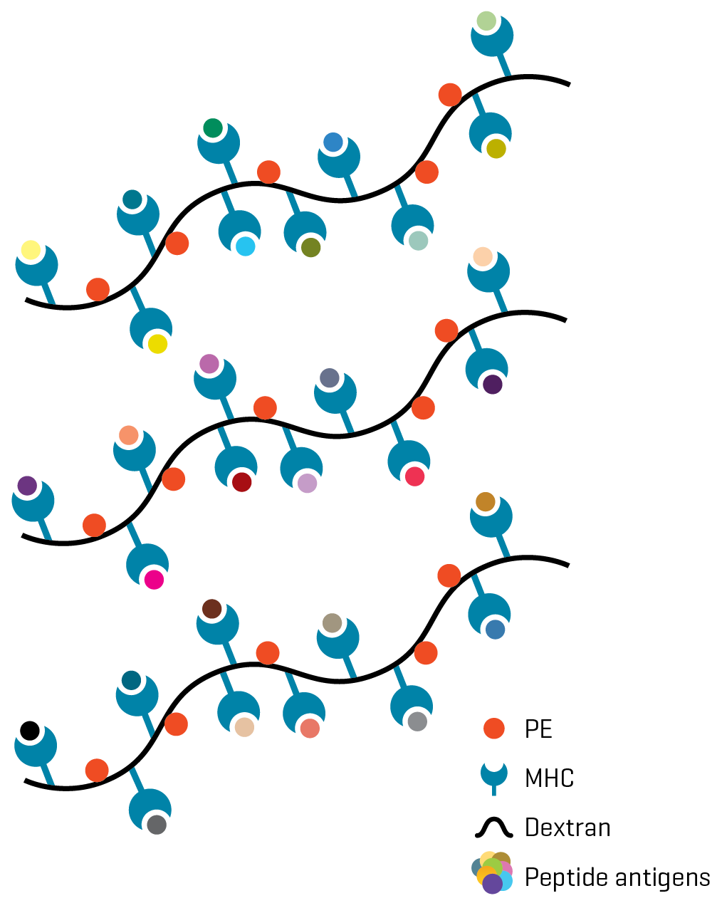 Instead of presenting a single pMHC monomer, MHC Dextramer® Peptide Pool Negative Control are decorated with MHC monomers that all present different peptides. In addition, no two MHC Dextramer® Peptide Pool Negative Control molecules are likely to be composed of the same combination of pMHCs.