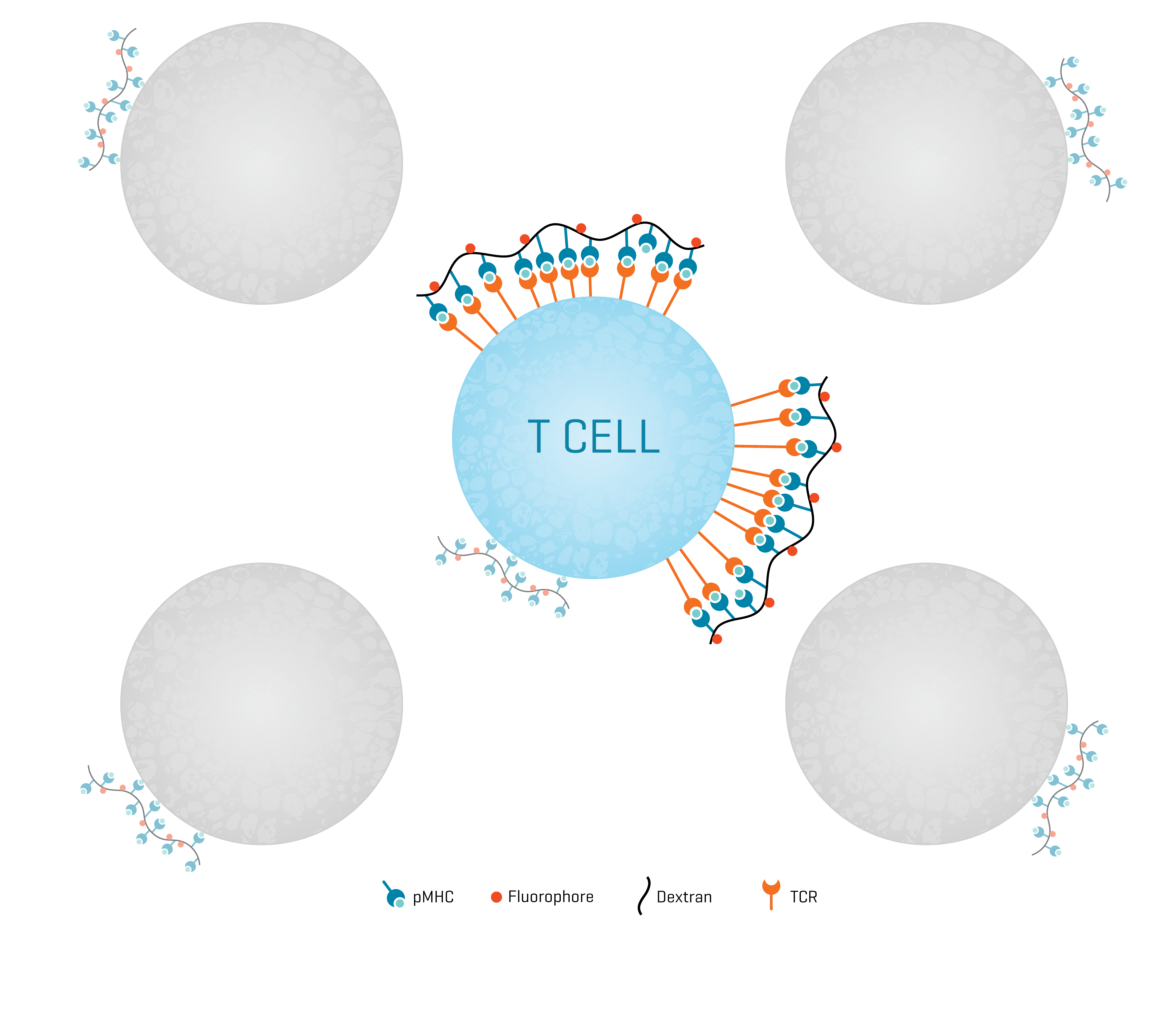 MHC Dextramer® are powerful flow cytometry reagents that bind with high avidity to antigen-specific T cells. This is a result of multiple simultaneous interactions at the cell surface between peptide MHC monomers on the Dextramer® and TCRs that recognize them. However, weaker general protein-protein- and other interactions not directly related to antigen recognition result in background staining of cells with lower intensity.
