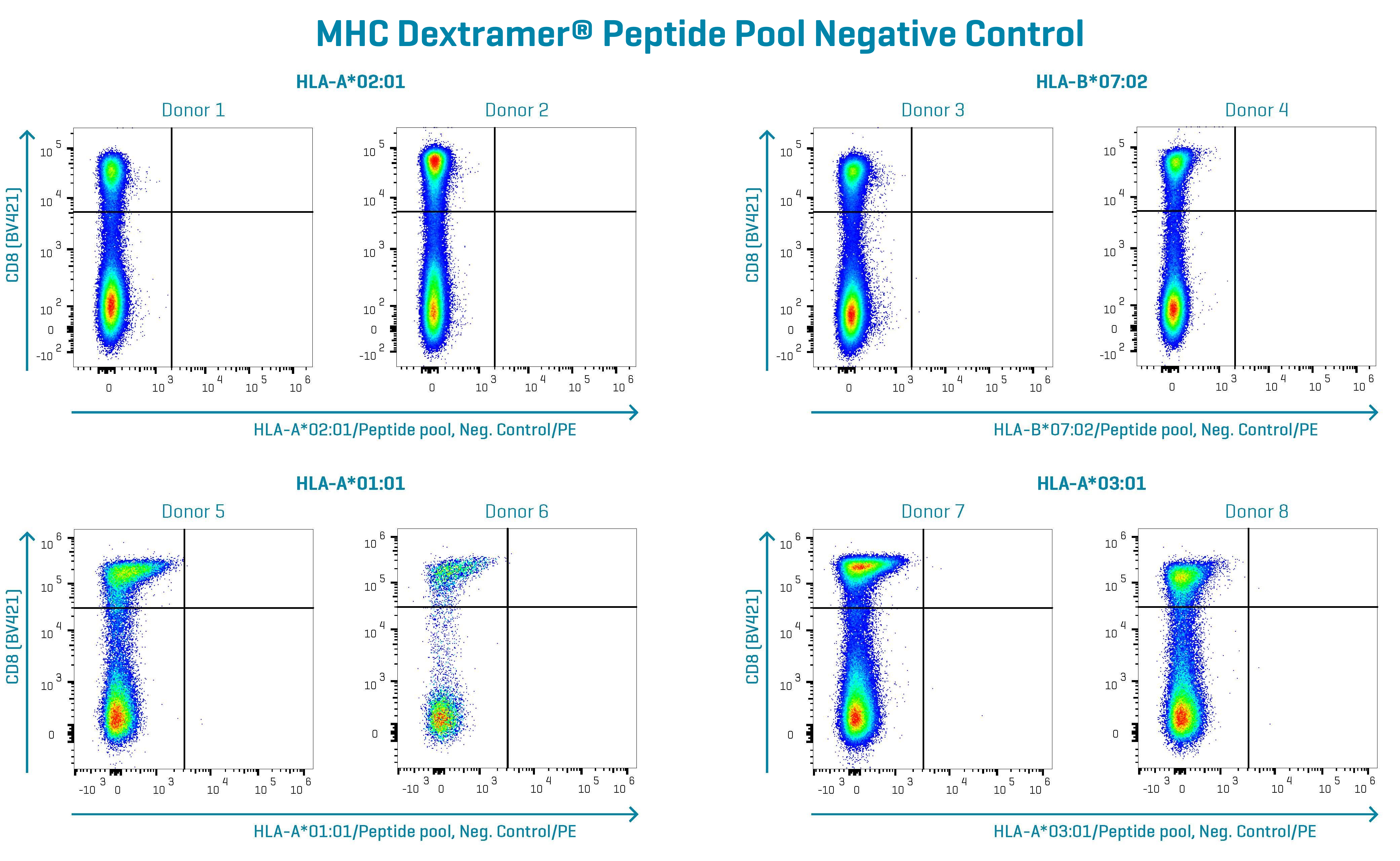 MHC Dextramer® Peptide Pool Negative Control were used to stain multiple allele matched donor samples, which were then analyzed by flow cytometry. Representative flow charts show the very limited background staining observed with these reagents.