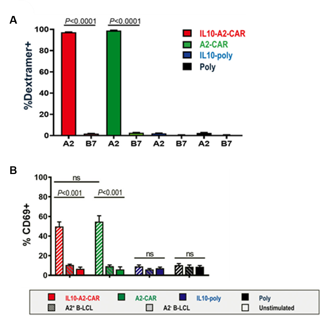 - Both IL10-A2-CAR-Tregs and A2-CAR-Tregs upregulated CD69 after co-culture with the A2+ B-LCLs (49.9 ± 4.6% and 54.9 ± 5.9%, respectively) but not after co-culture with the A2− B-LCLs (Fig. 1B).