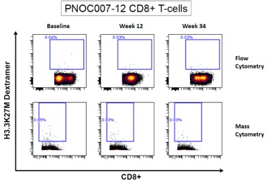 Fig.1. Mass cytometry-based detection of H3.3K27M- reactive CD8+ T cells is as sensitive as conventional flow cytometry using H3.3K27M Dextramer®. CD8+ T cells were detected from the same patient on both flow cytometry (above) and mass cytometry (below), exhibiting comparable percentages of overall CD8+ T cells that were identified as H3.3K27M-reactive.