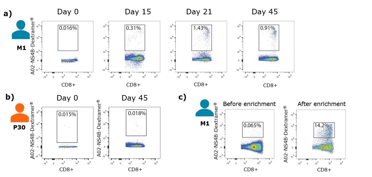 Isolation of NS4B-specific T cells of donor M1 a) and b) donor P30 on different timepoints after YF vaccination. c) Number of NS4B-Dextramer®-positive cells before (left) and after (right) enrichment on the magnetic beads. FACS was performed on donor M1 before the second immunization.