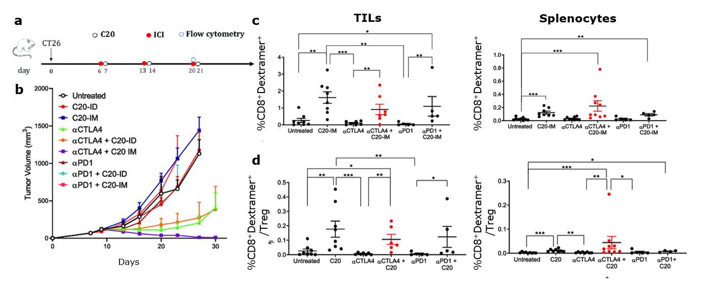 Balb/c mice were subcutaneously inoculated with 1x106 CT26 in the right flank. Mice were immunized with C20 on days 7, 14, and 21 and received ICI therapy on days 6, 13, and 20 (Fig. 1a). Researchers measured tumor growth twice a week for tumor growth studies. To identify immune correlates with the antitumor activity observed against established CT26 tumors, neoantigen-specific T-cell immune responses were analyzed in intratumoral lymphocytes and compared to splenocytes on day 20. For the flow cytometry assay, lymphocytes were harvested, single cells prepared, and stained with different antibody panels, including MHC Dextramer® (H-2Dd/SGPSYATYL).