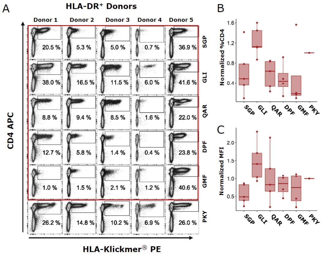 Fig. 1: Epitope recognition. A) Staining with peptide-HLA Klickmer®in five HLA-DR1+ donors for identification of epitope responses. Responses were measured as B) CD4+ T cell expansion or C) median fluorescence intensity