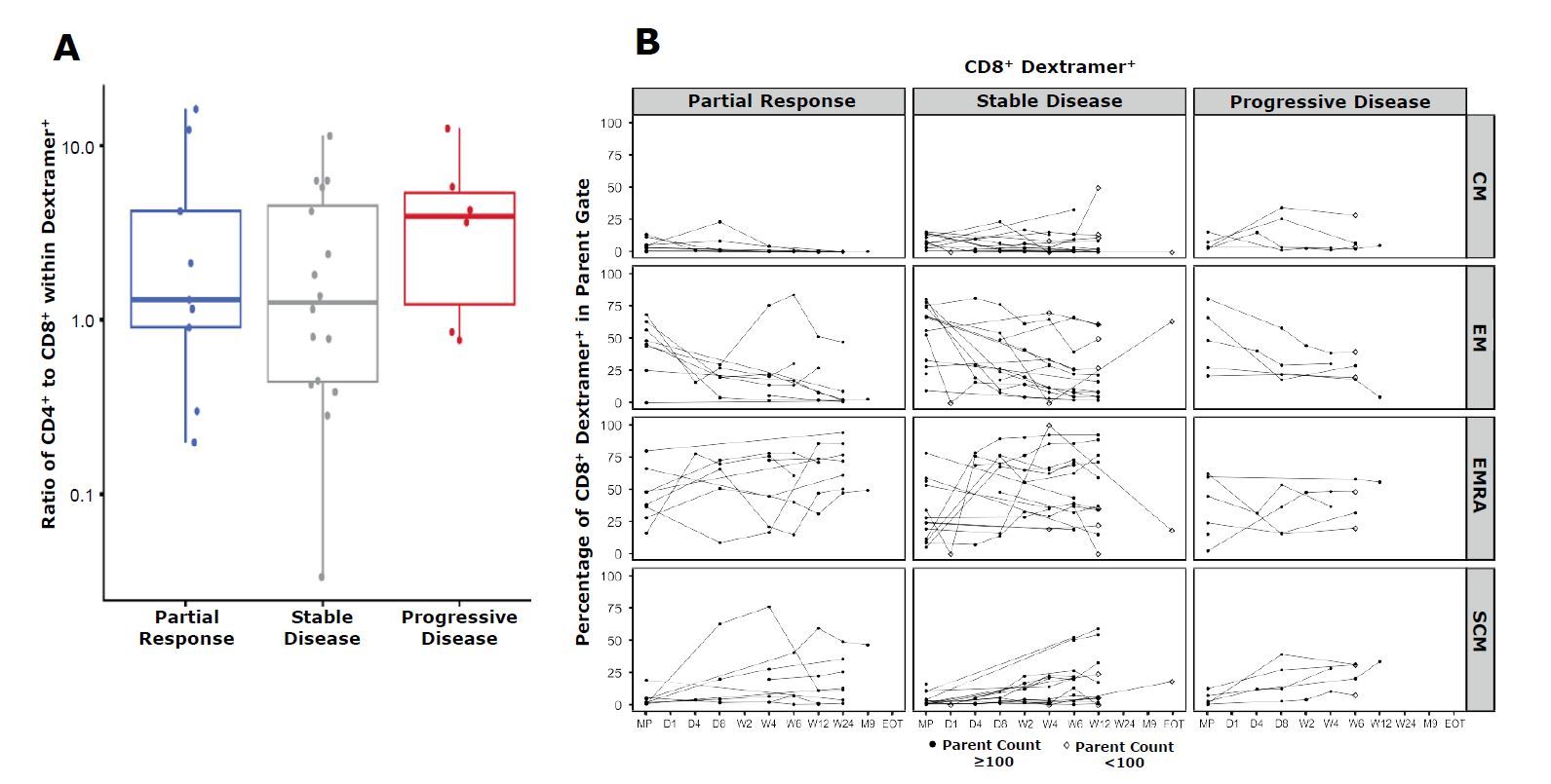 GMP-grade MHC Dextramer®reagents were used to assess A) CD4-to-CD8 ratio of the manufactured product, and B) cell type subsets before and after infusion