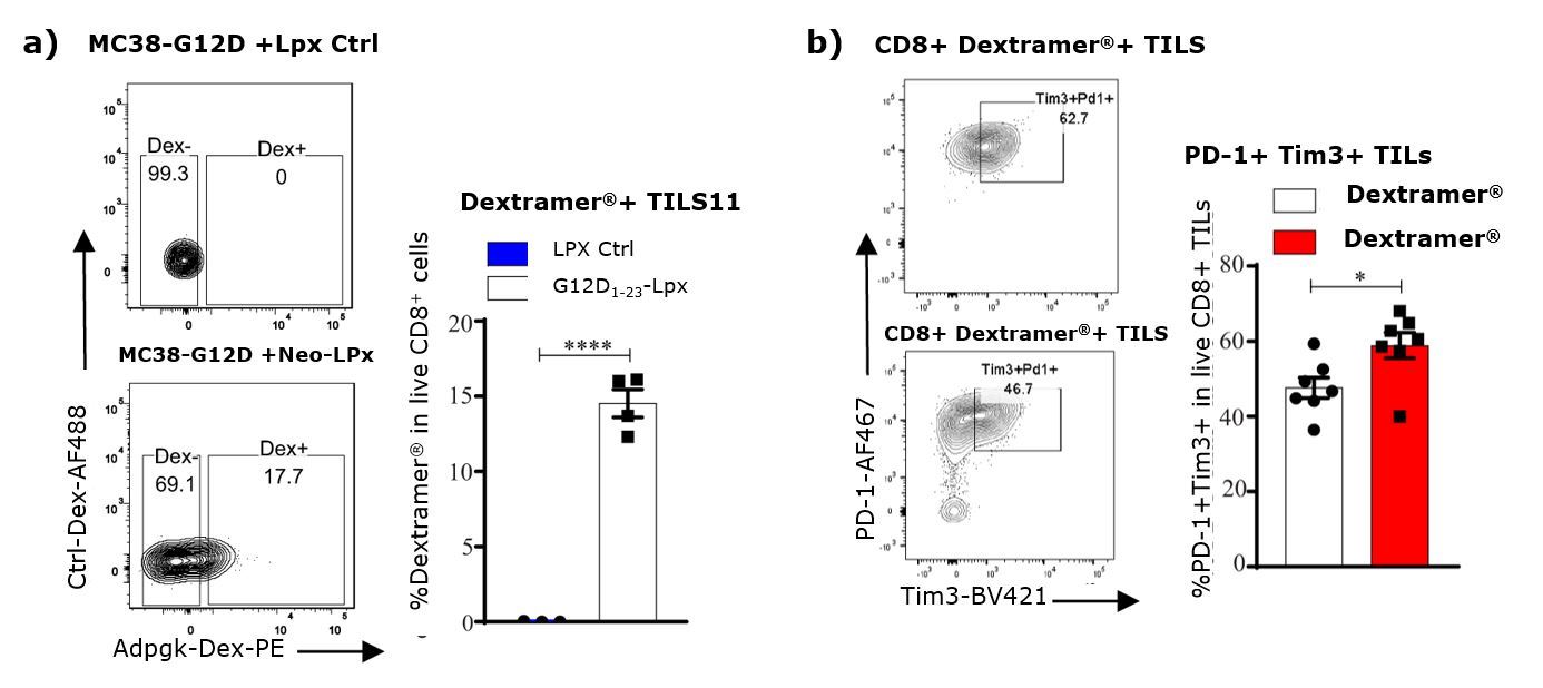 Fig. 1: Detection and checkpoint signature of tumor-infiltrating, Adpgk-specific CD8+ T cells. a) Detection of mutant Adpgk-specific CD8+TILs in mice immunized with Neo-Lpx using an MHC I Dextramer® specific for the mutated neoantigen peptide Adgk derived from the antigen G12D. b) TILs specific or not for Adpgk using MHC I Dextramer® staining were analyzed for PD-1 and Tim3 expression.