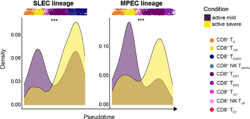Fig. 2 Distribution of cell type frequency for active, mild, and severe COVID-19. SLEC = short-lived effector cells. MPEC = memory precursor effector cell.