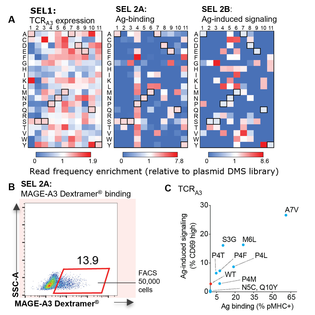 - Deep mutational scanning of CDR3β revealed enrichment of wild-type MAGE-A3 TCRA3 sequences in most selections, except for antigen-induced signaling, in which wild type TCRA3 was depleted (Fig.1A, SEL 2B boxes)