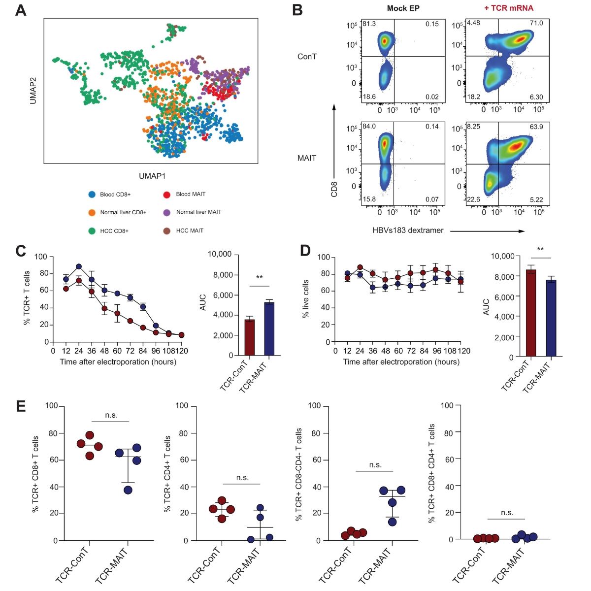 - Together, these data demonstrate that blood-derived MAIT cells represent a readily accessible cell source. The MAIT cells can further be engineered with an HBV-specific TCR with high but transient efficiency for potential treatment of chronic HBV infections to prevent liver cancer.