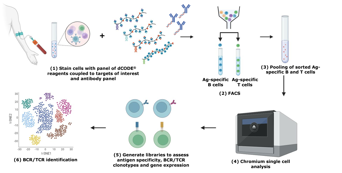 - More than phenotyping: Combining dCODE® reagents single-cell multi-omics to characterize gene expression profiles, surface markers as well as BCR and TCR clonotypes.